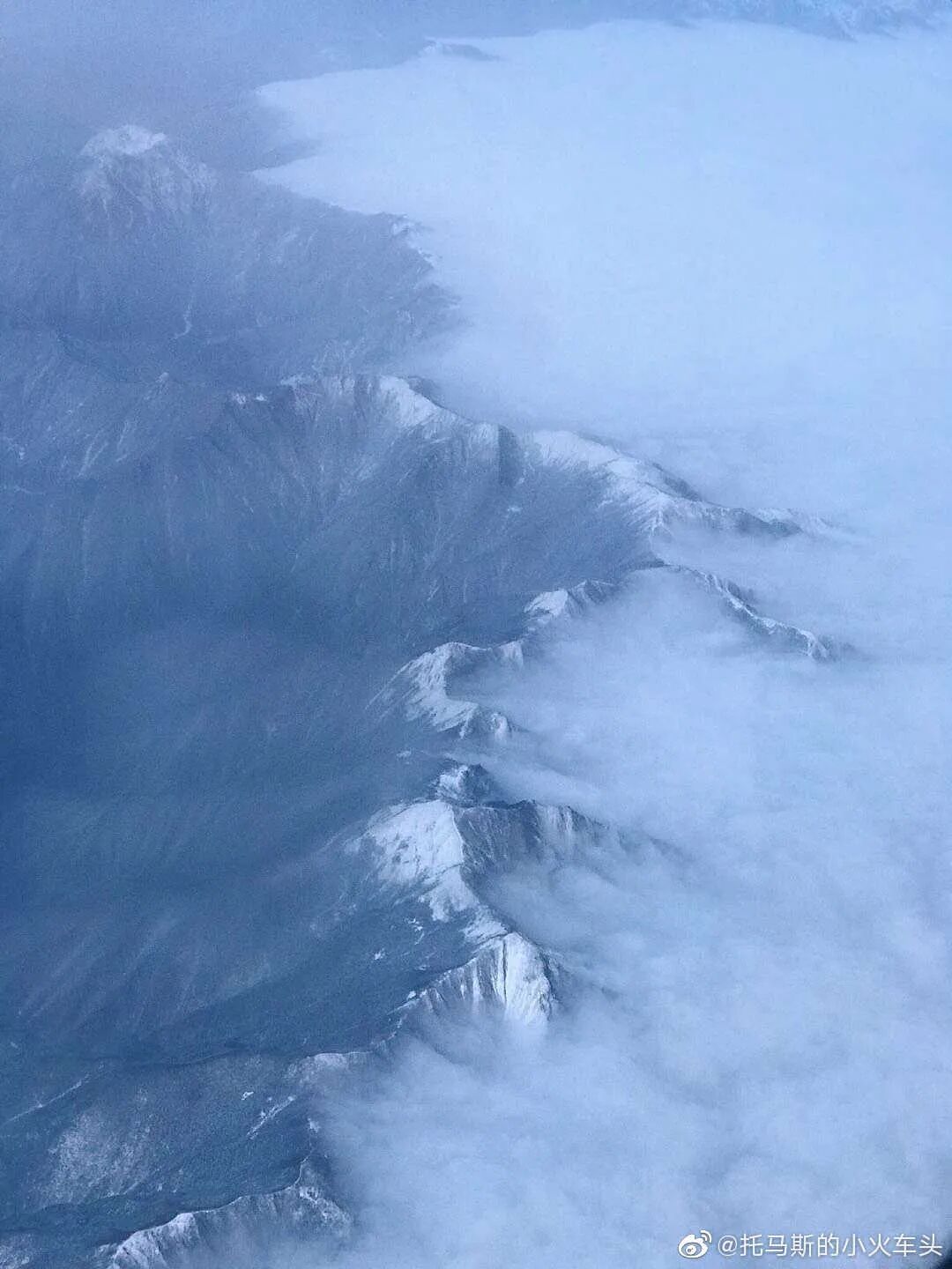 飞机上航拍的秦岭,以一己之力,挡住南下冷空气。