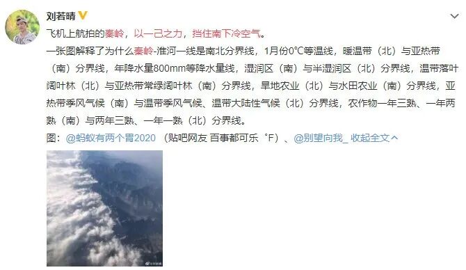 随后@中国天气 发长文进行科普**《秦岭,真的能用一己之力挡住南下冷空气?》**: